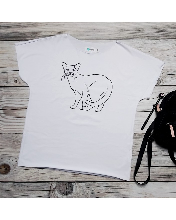 Bluzka z rysunkiem kota rosyjskiego niebieskiego wykonana z delikatnej bawełny o gramaturze 155 Dekolt, rękawy i dół bluzki surowo wykończony Nadruk wykonany metodą sitodruku Rysunek wykonany przez nas z największą starannością aby uchwycić piękno rasy 100% bawełna